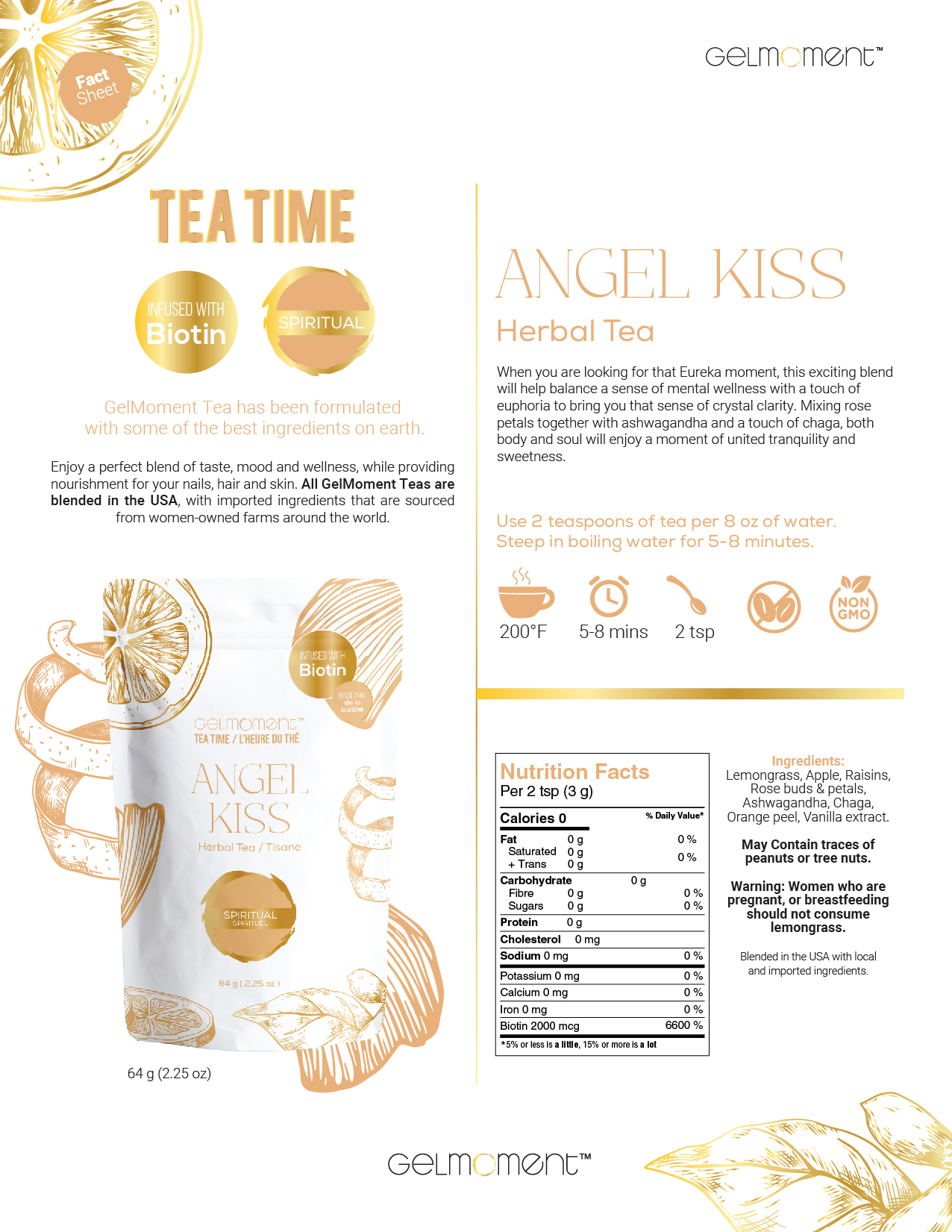 Lemongrass, apple, raisins, rose buds & petals, ashwagandha, chaga, orange peel, vanilla extract.
