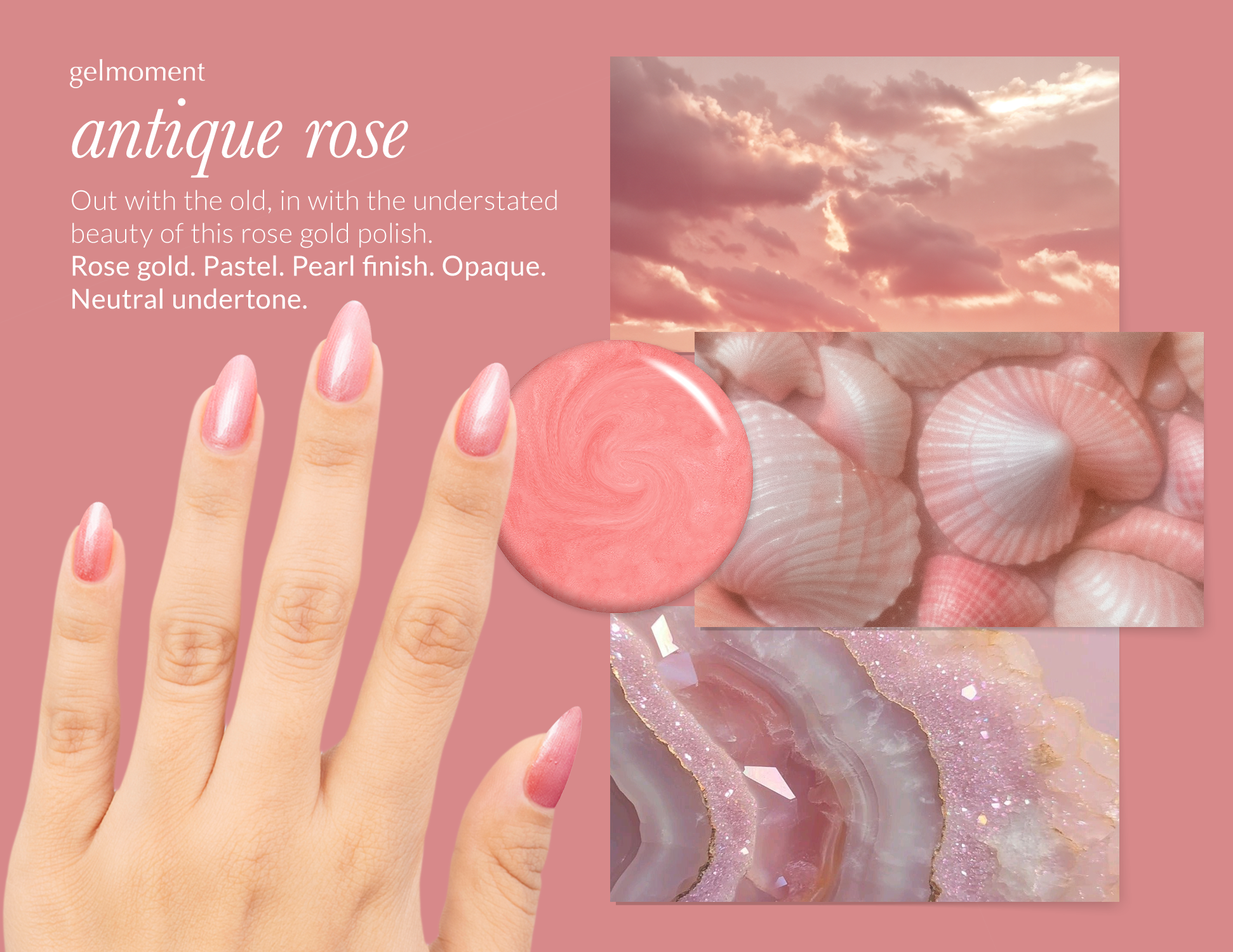 Rose gold. Pastel. Pearl finish. Opaque. Neutral undertone.